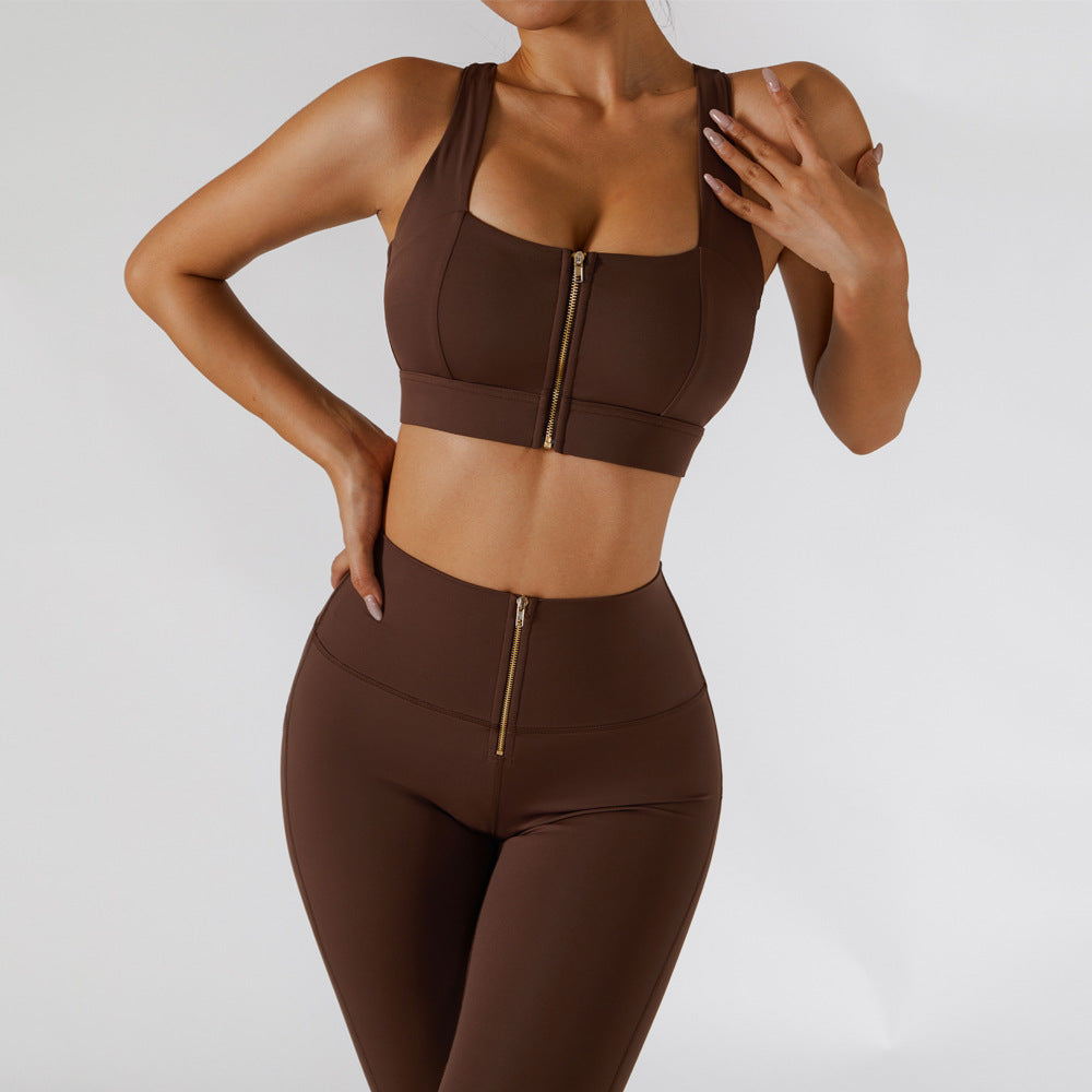 High-strength nude sports bra pants set zipper hip push-up fitness clothes summer Gym clothes